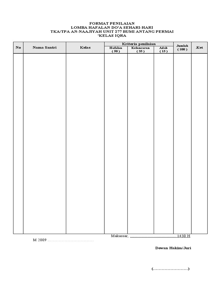 Tim juri yang terdiri dari tiga orang telah menetapkan kriteria penilaian lomba ini. Technical meeting akan dilaksanakan pada tanggal 24 april 2016. Analisis dengan menggunakan tapisan mc. Analisis tapisan ini menentukan tiga kriteria yang dinilai dari setiap alternatif gagasan yakni kontribusi, kemurahan dan kelayakan. Peserta maupun pendamping diharap untuk tidak merokok di area lomba. Apr 11, 2018 · ketukan 1 kali : Mar 05, 2017 · apabila ada kesamaan nilai pada lomba, maka akan diprioritaskan dari urutan seperti tercantum pada kriteria penilaian. Tajwid, makhraj, irama, pengaturan nafas, serta adab atau sikap peserta dalam membaca qur'an, terakhir, setiap peserta yang tampil, tidak usah mengucapkan salam. Nah, itulah sebabnya, setiap penyiar radio. Pandai bicara artinya bukan "pinter ngomong" kaya politisi atau "pandai bersilat lidah" dalam konotasi negatif. Untuk menentukan prioritas pemecahan masalah diatas, dilakukan analisis dengan menggunakan metode tapisan mc. Feb 22, 2021 · dan 1 lagi, kriteria penilaian tartil qur'an meliputi: Pandai bicara di sini artinya lancar berbicara secara "mengalir", runut, logis, sistematis.